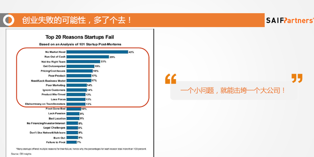 这是个多选题,一共列了20个创业失败的原因。之前有大佬说,一个创业公司如果基础不行,随便一个小问题都能把他击垮。今天在座各位的项目都非常早期,可能还没有多么深刻的体会,但当你的公司越做越大的时候,你一定会如履薄冰,你会感觉越来越累,越来越谨慎。很多著名公司一夜歇菜,可能就是因为一个很小事件,甚至不是技术产品方面的原因,就是一个PR事件。
